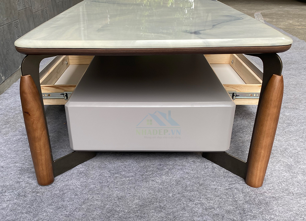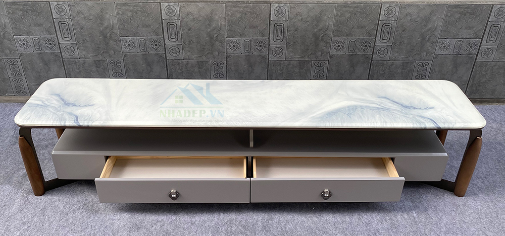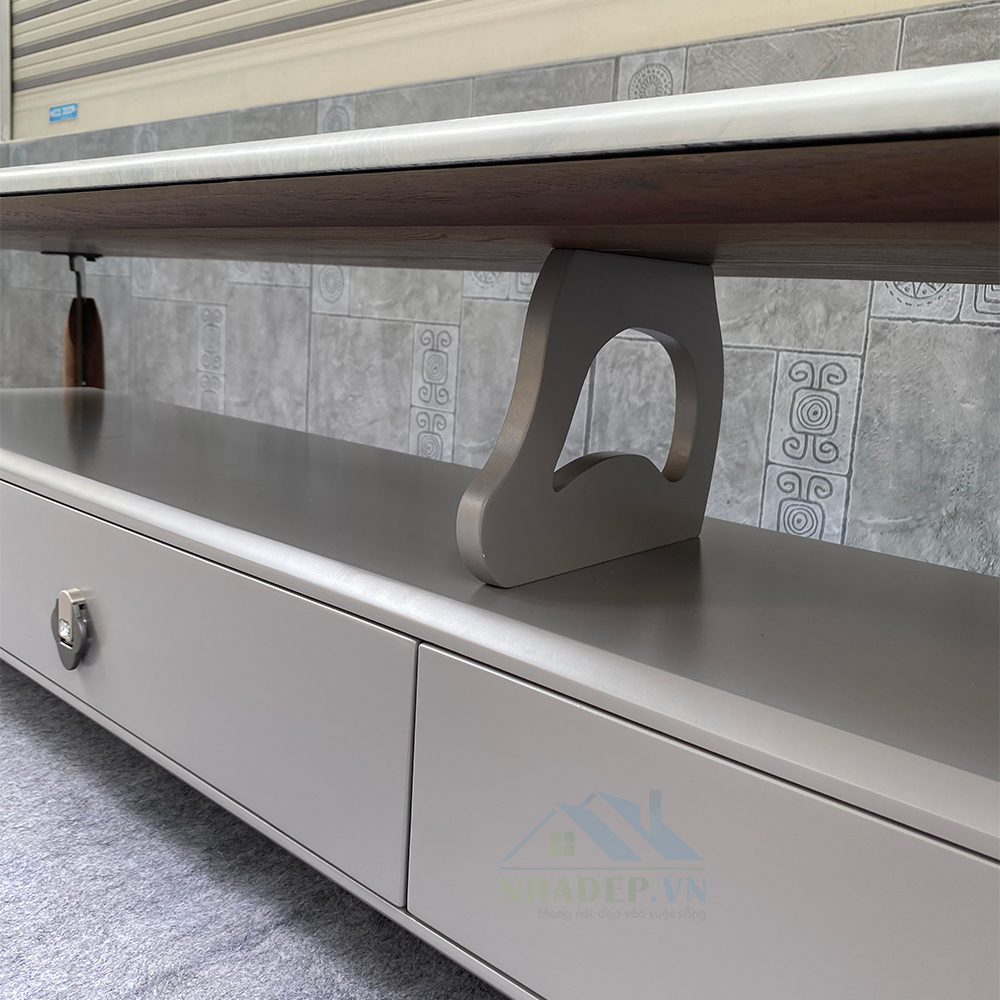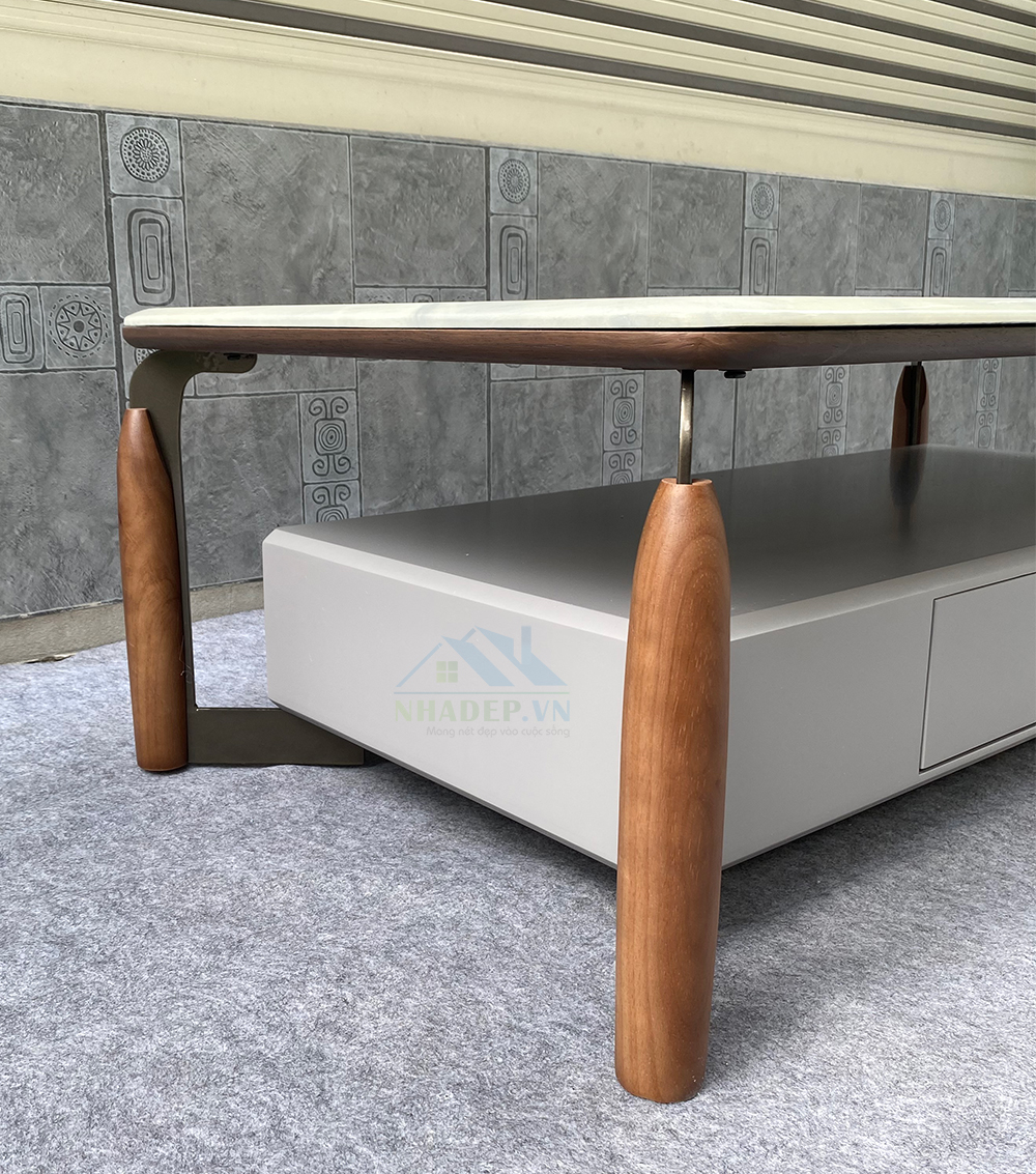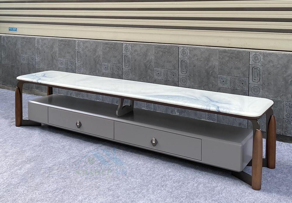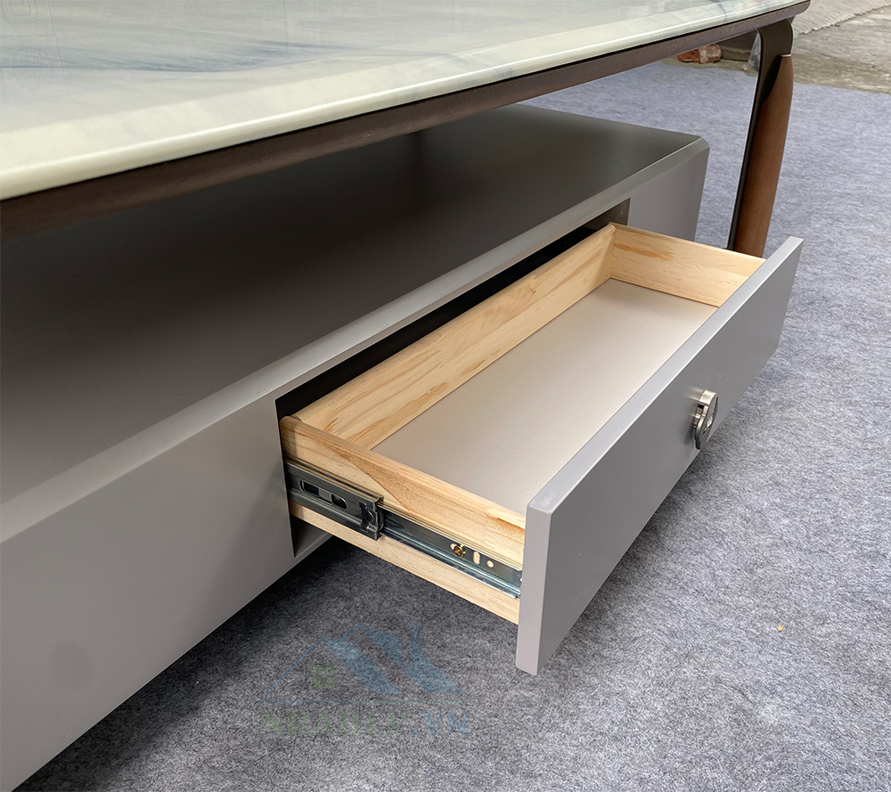 - Chất liệu: gỗ MDF, chân thép, mặt bàn & kệ tivi đá nhân tạo.